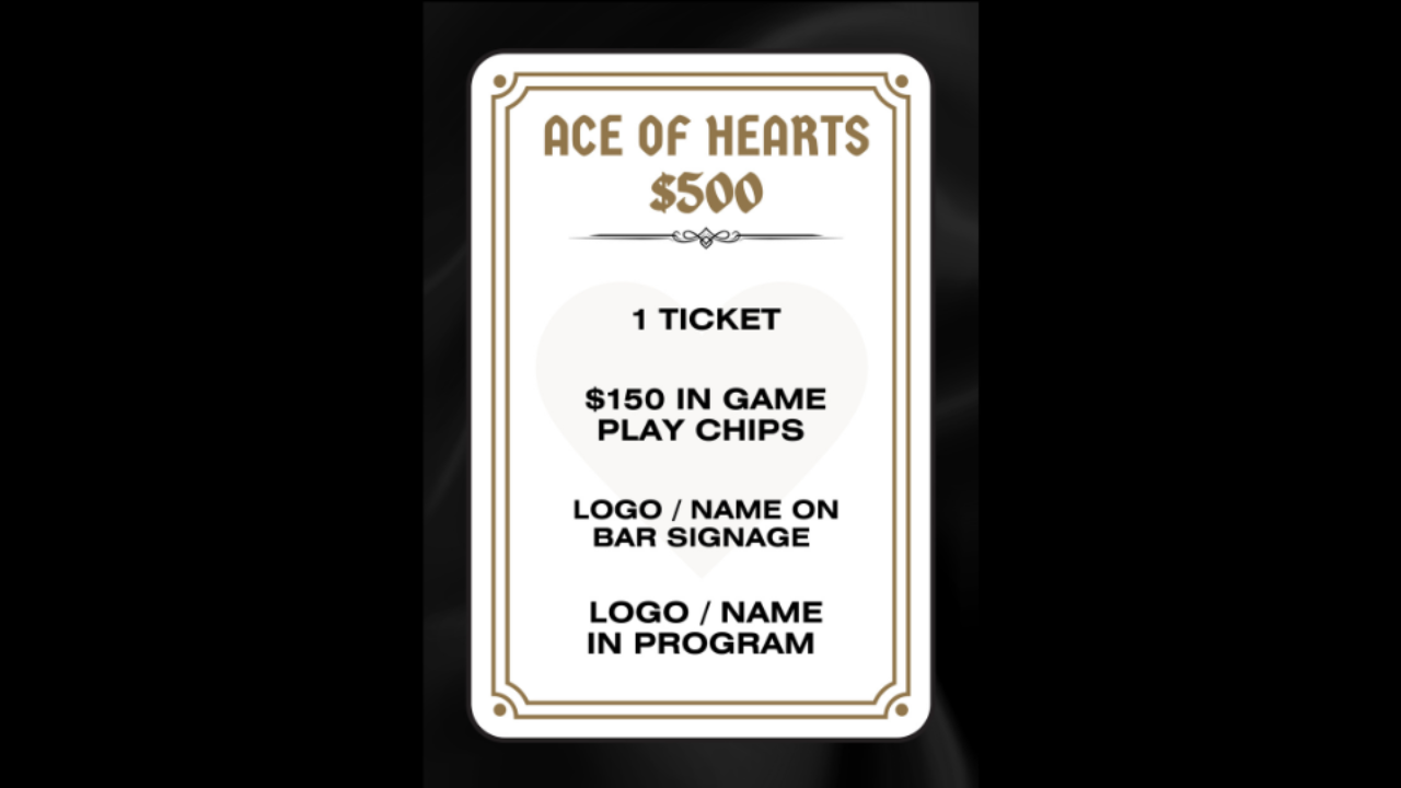 The Ace of Hearts Sponsorship Package includes one ticket, $150 in game play chips, your (company's) name and logo on bar signage & program.